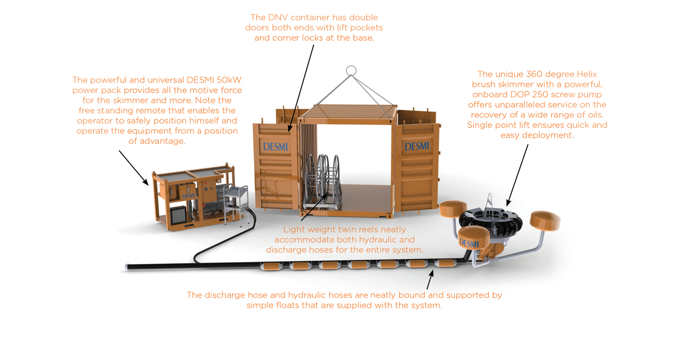 A complete standard equipment system to suit the offshore environment. The system includes; a DESMI HELIX 250 Brush Terminator skimmer with a 50kW diesel hydraulic power pack.