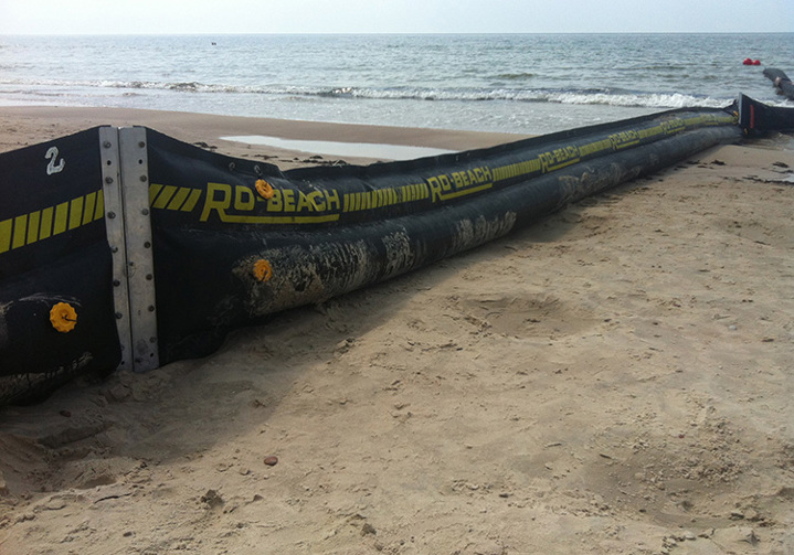 RO-BOOM BEACH is a special purpose containment boom that utilises water ballast. The water is pumped into two adjacent tubes along the bottom of the boom. This water acts as ballast when the boom is floating; once the boom is stranded these tubes sit on the ground and form a seal. The two fins running the length of the water tubes aid this effect. The RO-BOOM BEACH is able to make the transition between the water and land, which prevents the spread of oil in these regions.