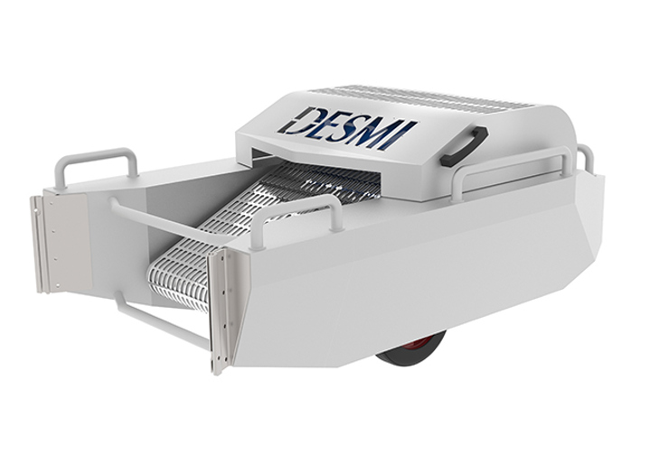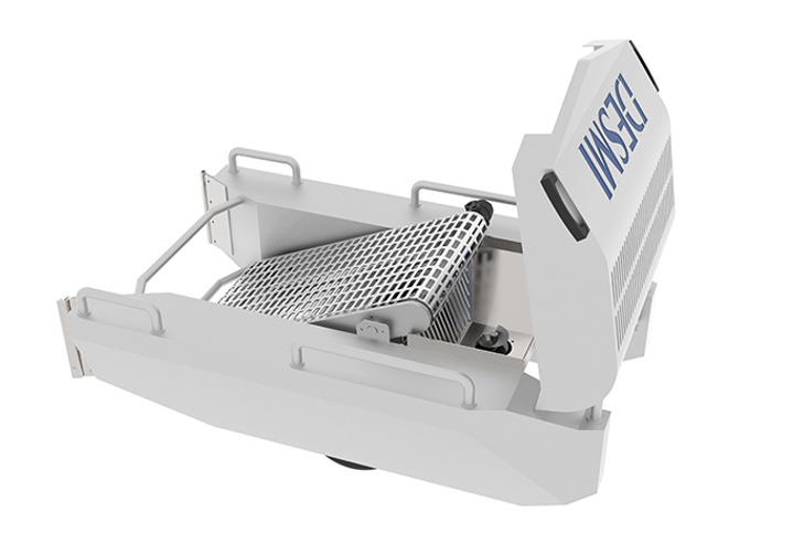 - Stainless steel open mesh conveyor belt feeding the skimmer pump