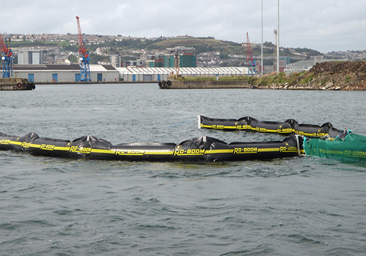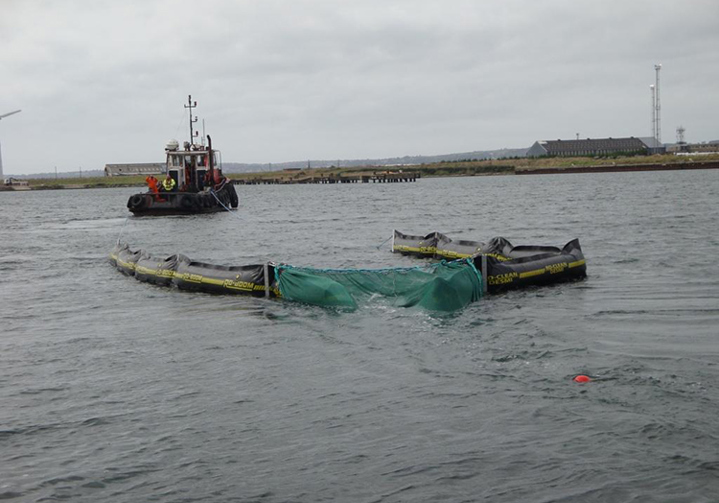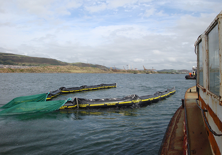 The other end of the guide booms has tow bar and towing rope connected to one or two towing boats. If towing